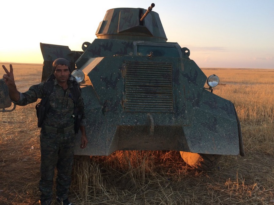 From the twitter page of BBC Middle East Correspondent Quentin Sommerville, here are a couple pictures of improvised AFVs being used in the fight against ISIS in Iraq/Syria.